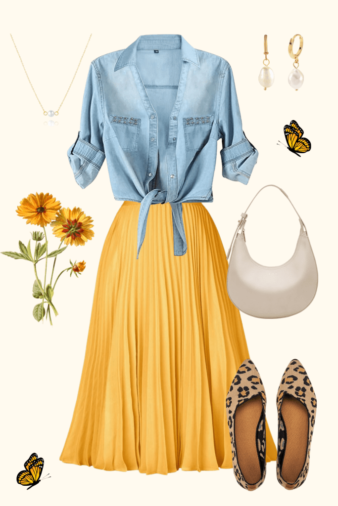 For a sun shinning look, try pairing a bright yellow skirt with a denim top. Leopard print flats make this look even more fun!