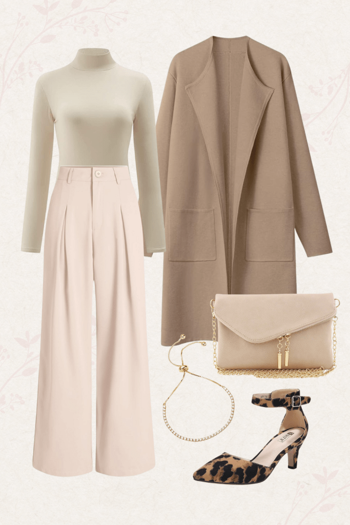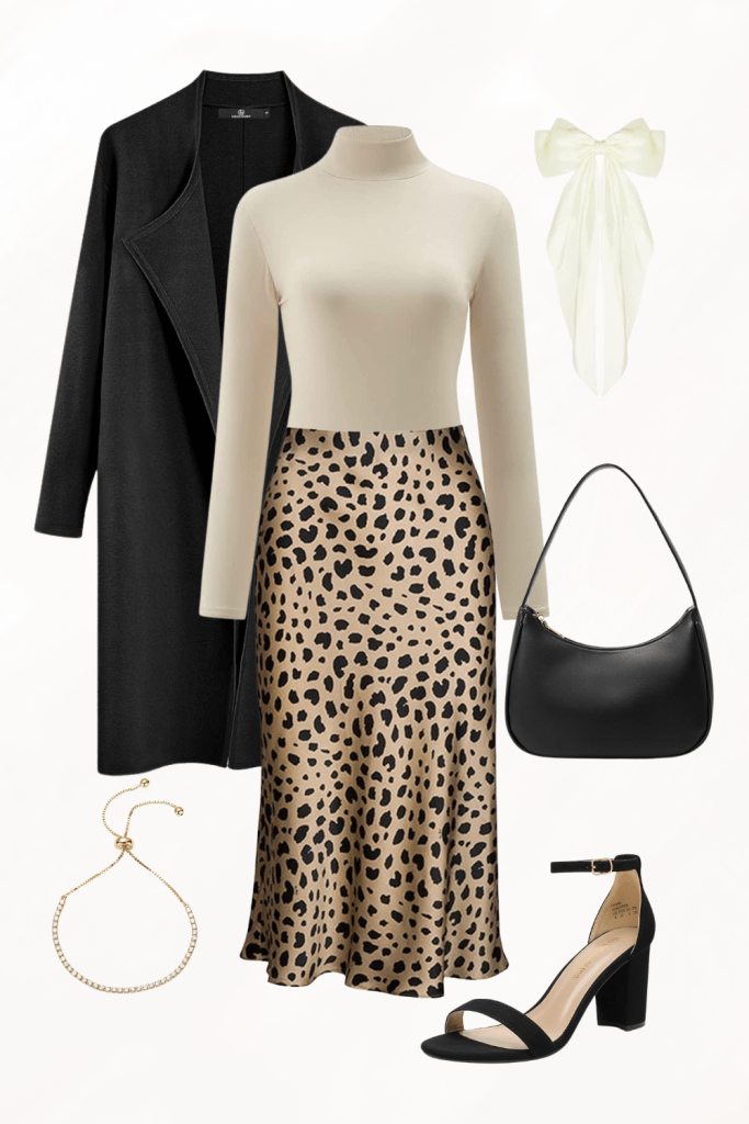 Here is a great look for work. We are going monochrome with the nude colors with the a splash of fun with the leopard print heels.