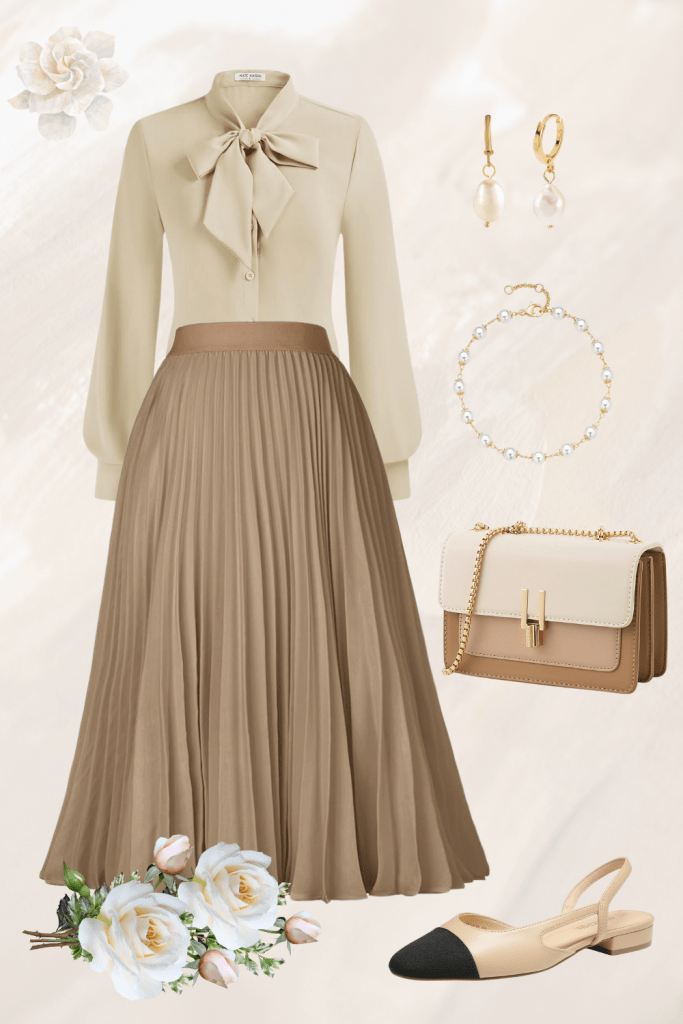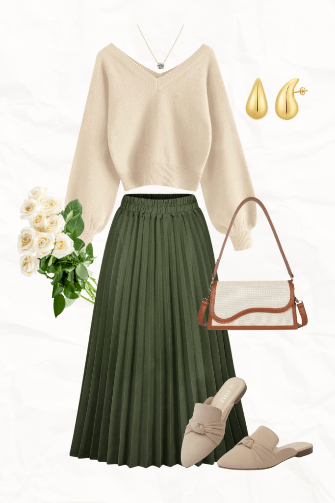 Elevate your casual look with this great weekend outfit. Perfect for bunch or simply strolling around town in. A flowy skirt pairs well with a cozy cool sweater keeping you warm for the cool spring days.