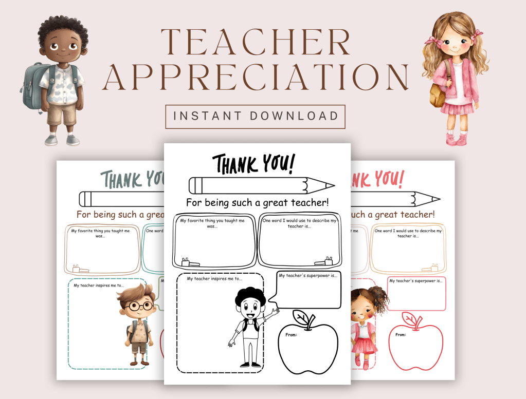 A heartfelt thank you note can go a long way in showing your appreciation to a teacher. Take the time to write a personalized message showing your gratitude for everything they do. Share specific instances where their teaching made a positive impact on your child’s life. Having your child write something special can mean so much. Handwritten notes are meaningful and can be loved for years to come. Consider including a small gift, such as a gift card or a favorite snack, to go with your note. Or grab our cute printable for your kids to fill out all bout what makes their teacher special!